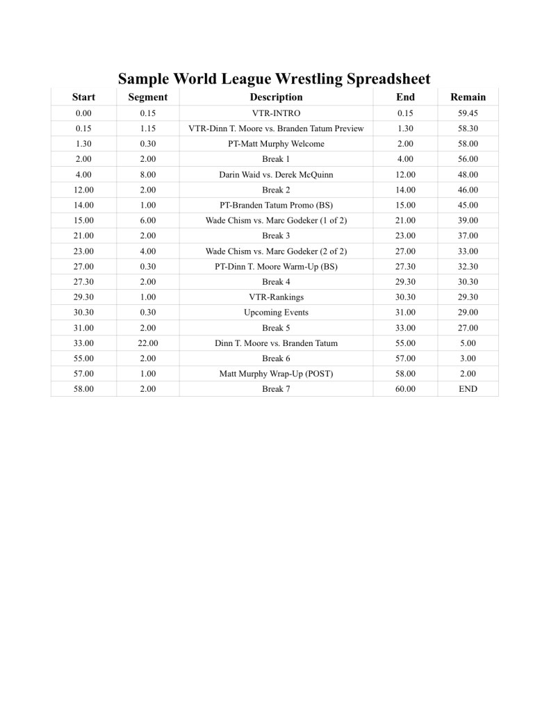 I used a VTR (video-tape recorded) package summarizing the story between the main-event wrestlers to open the show. I also added a pre-taped (PT) backstage (BS) promo by Branden Tatum and a 30-second PT-BS video showing Dinn T. Moore getting psyched up for the match. I used PT instead of VTR to remind myself that we didnāt already have that footage in the bag, that it needed to be taped before the event started. I wanted viewers to really get excited for the main event, a match that would settle a brutal feud between former partners, so this program ended with closure instead of a cliff-hanger. It was the end of a chapter in both mensā careers. I also didnāt want to take attention away from the build of this match, so I didnāt have anybody else cut a promo during this program. I previewed next week in the wrap-up, but I really wanted this match to make fans think that this was something they were very lucky to get on free television.