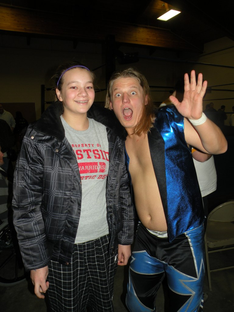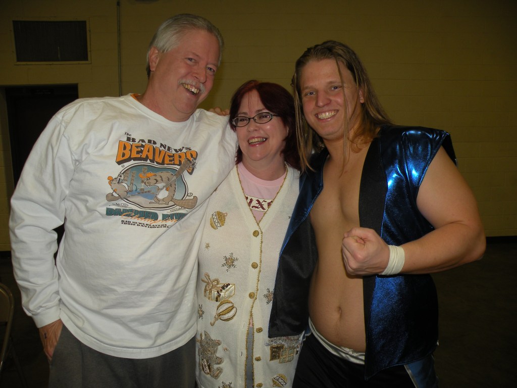 On this night I first caught up with Samie Holzapfel from Omaha Nebraska that stated that her favorite was Matty Star. Then I went on the other side of the ring and met a couple, Jeff and Heidi Lowe who was also from Omaha Nebraska and was a Matty Star fan. To be honest I wasn’t for sure who Matty Star was but at PWP he was well liked. I got my boyfriend Brian who lives and breath wrestling (In fact it is a day after Christmas and we are not going to a show and it is killing him (I am sure if the roads wasn’t covered with snow we would be checking out some promotion called ICAW because Mike Sydal and Brandon Espinosa is suppose to be there) to see if Matty would come out to get his picture taken .