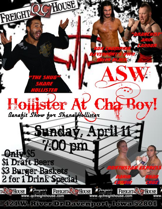 Come out and support the injured wrestler “The Shug” Shane Hollister! Shane broke both his tibia and fibula on March 7th, and can’t work at this time. Admission is only $5! Come see all your favorites like AJ Smooth, Montoya X, Jeffery Dark, Bobbi Dahl, Le Chef, Johnny Wisdom, Sparrow, Brandon Lyonz, Steven Youngblood, Brian Gott, and many more… People are coming out of the woodwork to assist in helping Shane, so you never know who else just might show up! Sponsored by Ben O’ Neil @ Neon Dragon Tattoos.