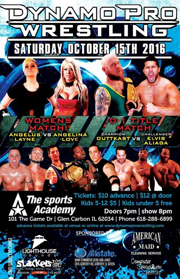 The Dynamo Pro Wrestling D-1 Championship will be defended at this event. At our last event, OuTtKaSt became the first two-time Dynamo Pro Wrestling D-1 champion in company history. After regaining the championship, “The Filipino Warrior” Elvis Aliaga attacked OuTtKaSt and demanded the first opportunity to challenge the new champion. OuTtKaSt immediately accepted the challenge. In addition, former multi-time Impact Wrestling Knockouts champion Angelina Love will be competing against Angelus Layne. Come out and see such Dynamo Pro Wrestling favorites such as Dynamo Pro Wrestling heavyweight champion Mike Outlaw, Dynamo Pro Wrestling tag team champions “High Level Enterprise”, Missouri Wrestling Revival Missouri State champion Brandon Espinosa, Keon Option, Justin D’Air, “The Intelligent Monster” “DirdEY” Jake Dirden, C.J. Shine, “The Bite Club”, and “The Cowboy” Ric Maverick,. For additional event information or to purchase advance tickets, log on to http://www.dynamoprowrestling.com or contact the Sports Academy at (618) 288-6899.
