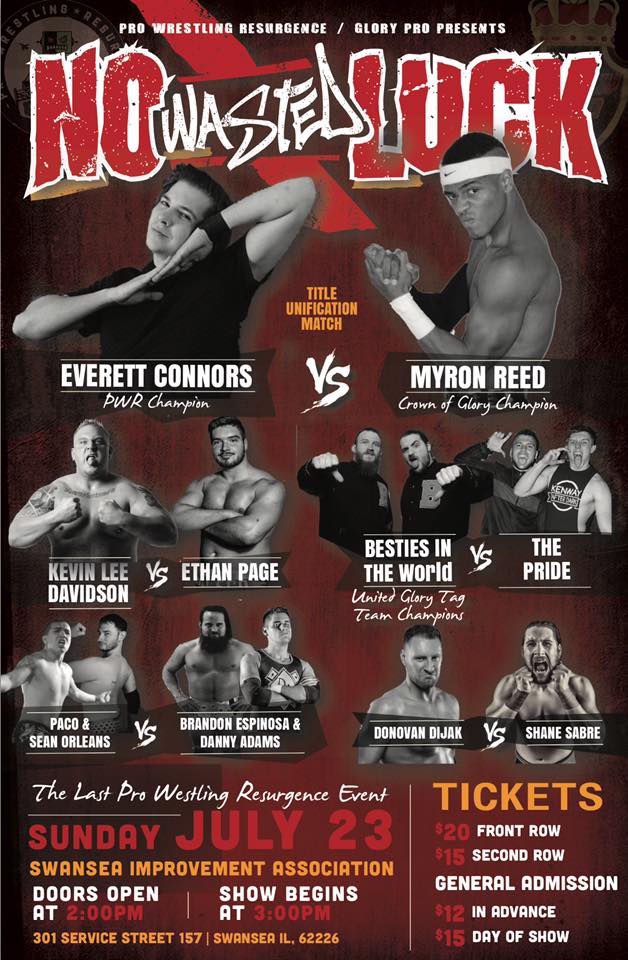 Tickets are moving for No Wasted Luck on Sunday, July 23rd in Swansea! Not only is 7/23 our 1 year anniversary, but our FINAL date before our merge with Glory Pro! Titles will be defended and unified! These fine match ups plus much more! E-mail prowrestlingresurgence@gmail.com to purchase your tickets!