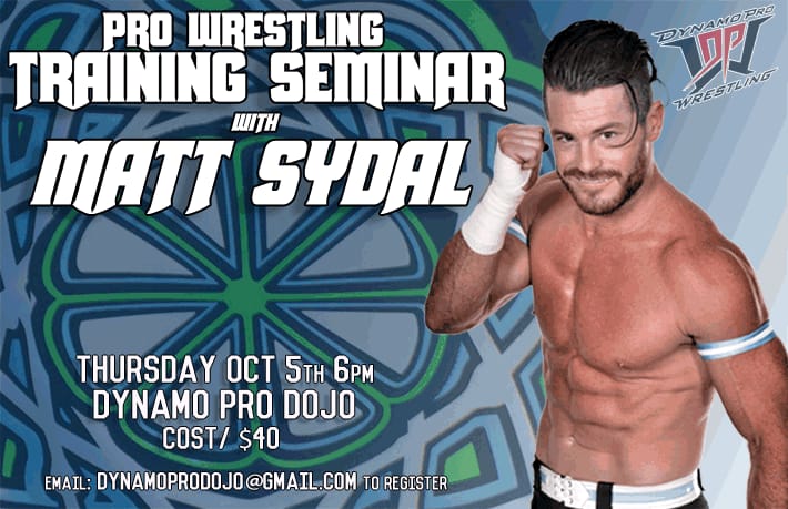 Pro Wrestling seminar with Matt Sydal on Thursday, Oct 5th at 6pm at the Dynamo Pro Dojo. Cost is $40