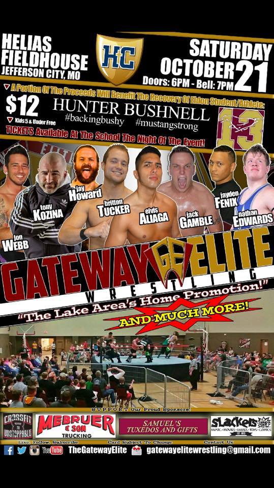 “The Lake Area’s Home Promotion” Gateway Elite Wrestling comes to Helias Catholic High School in Jefferson City, MO on Saturday, October 21st! A portion of the proceeds from that night will go to Hunter Bushnell, an Eldon junior, who recently suffered a severe neck injury during football practice. This event is for all ages and will be fun for the entire family. Please make plans to come out and enjoy an action-packed night of LIVE pro wrestling while supporting a wonderful cause!