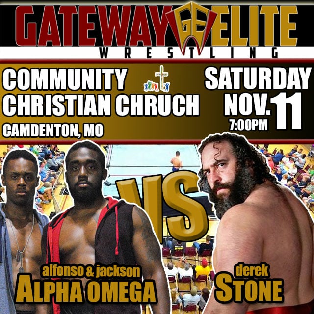 This Saturday night, newcomers Kenny Alfonso & Camaro Jackson (Alpha Omega) make their Gateway Elite debuts in a 2-On-1 Handicap Match against the more experienced Derek Stone. Will the quickness and teamwork of Alpha Omega or the power of Derek Stone prevail? Be there and find out! Tickets are just $12 and will be available at the door. Doors open at 6 PM. Event starts at 7 PM.