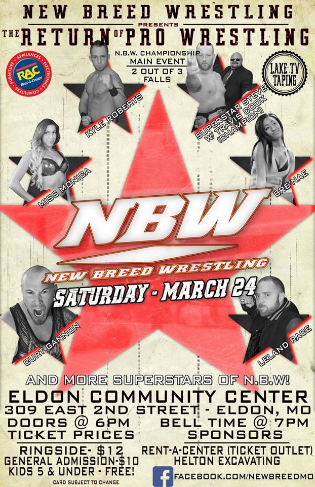 New Breed Wrestling Returns to Eldon, Mo on March 24th Steve Fender vs. Kyle Roberts, Miss Monica, Leland Race