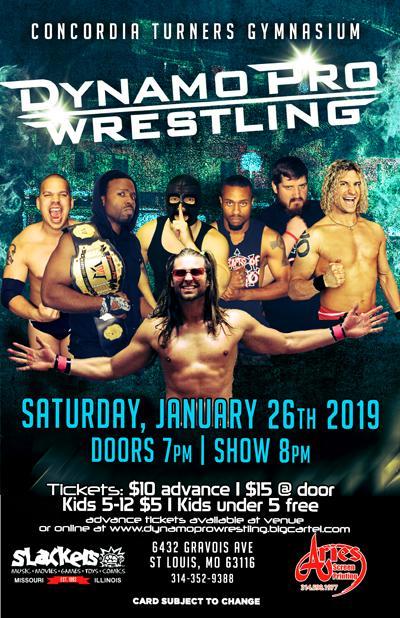 Dynamo Pro Wrestling is proud to announce an all-ages professional wrestling event on Saturday, January 26th, 2019. This professional wrestling event, sponsored by Slackers and Aries Screen Printing, will be held at the Concordia Turners Gymnasium, located at 6432 Gravois Avenue in St. Louis, Missouri. Doors open at 7:00 P.M. with a bell time of 8:00 P.M. Adult tickets are $10 in advance and $15 the day of the event. Tickets for children from five to twelve years old are $5. Tickets for children under five years old are free. Advanced tickets can be purchased at dynamoprowrestling.bigcartel.com. Come out and see such Dynamo Pro Wrestling favorites as Dynamo Pro Wrestling D-1 champion Mike Outlaw, Dynamo Pro Wrestling tag team champions “The Arch City Mercenaries”, C.J. Shine, “The Heartthrob” Jaden Roller, “The Valedictorian” Keon Option, Viktor von Stein, Xavier Shadowz, OuTtKaSt, Jackal, “Mr. Moustache” Ricky Rodriguez, “Mr. Excitement” Christopher Adams, and many more. Come out and experience the best in professional wrestling as Dynamo Pro Wrestling returns to the Concordia Turners Gymnasium!
