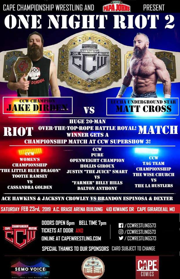 Cape Championship Wrestling and Papa John’s presents CCW One Night Riot 2, live at The Arena Building in Cape Girardeau, MO on 2/23/19.