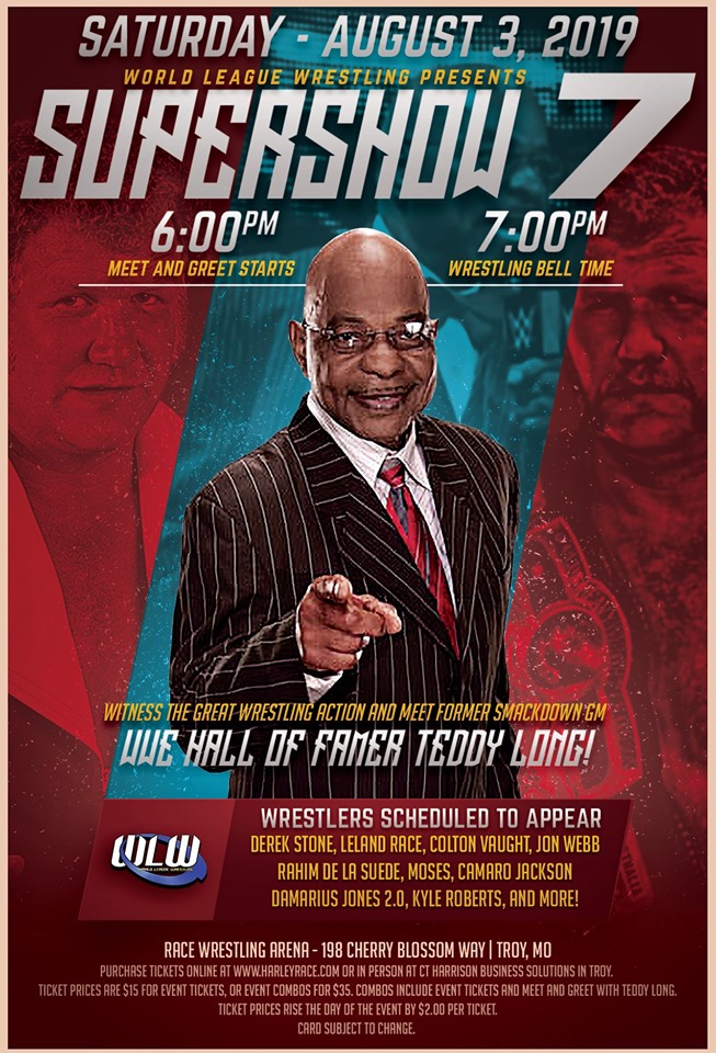On Saturday, August 3, Harley Race’s World League Wrestling presents Supershow 7! Fans will get to chance to see the top-notch wrestling matches that WLW puts on every event, plus have the opportunity to meet WWE Hall of Fame member and former Smackdown Live General Manager – TEDDY LONG!