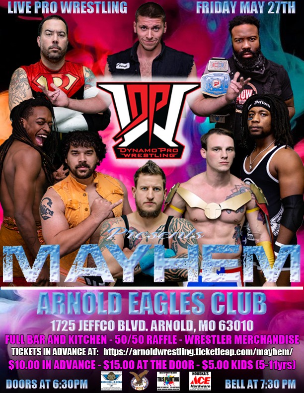 Dynamo Pro Wrestling returns to Meramec Arnold Eagles Aerie #3678 for a night of professional wrestling action on Friday May 27th. Doors at 630 bell 730. Come for the wrestling, stay for the food. Delicious burgers and so much more.