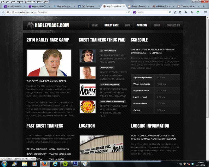 Wrestlers then will want to make sure they do not miss the opportunity to train at THE week long camp of the year if you are looking for the opportunity to get your foot in the door to the highly-prestigious Harley Race Wrestling Academy, well then the chance is waiting on you! November 10th through the 14th, the Harley Race Wrestling Camp will be underway! Gedo (New Japan Pro-Wrestling), Ishimori (from Pro-Wrestling NOAH), Dr. Tom Prichard, and Beautiful Bobby Eaton will all be guest trainers for the annual event.