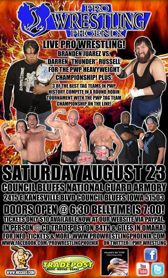 Ticket just $10!! Available via Paypal at http://www.ProWrestlingPhoenix.com – in person at CD Tradepost at 84th & Giles in Omaha – or at the door the day of the event.