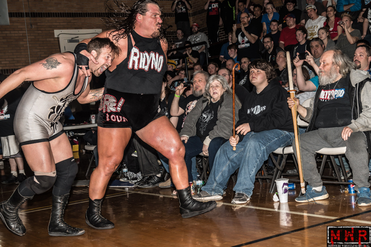 The ring would not be big enough early on as the two fought up and down the bleachers of MPW, as the fans ran for cover and tried their best to get a photo of the brutal action as the two me tore into each other. After several moments of intense action Wyatt dropped Rhino on his head with the lightning spiral and had him beat. Stride distracted referee Michael Crase right before the 3 count for what looked to be the win. Yet, Strider quickly got the referee’s attention to stop the count.