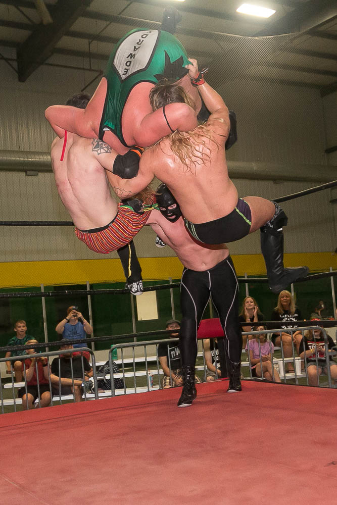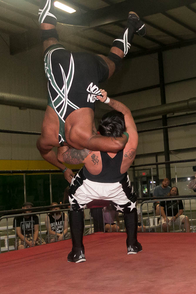 -Jimmi LaFleur(w/ Tony Esteem) d. Camaro Jackson by blocking a re-entry sunset flip and hanging onto Esteem for illegal leverage (7:48).