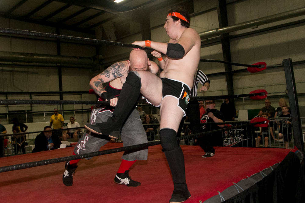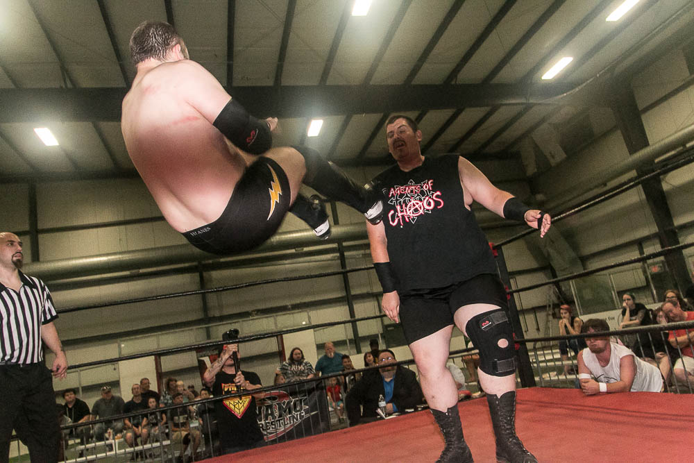 –”The Caramel Bear” C.J. Shine d. Heavyweight Champion “The Wind Of Destruction” Makaze by DQ when Makaze choked Shine with a leather strap (9:09). Adrian Surge hit the ring with a strap of his own to run off the champion. Makaze brought out all of the roster’s rulebreakers as backup to surround the ring, but Surge had plenty of his own backup…and the entire roster had to separate the two as they brawled! This led to Surge challenging Makaze to a lumberjack strap match at the September 21st show in St. Louis…Makaze didn’t want to accept, but co-promoter Crystal Yount said the match would happen or she’d strip Makaze of the title!