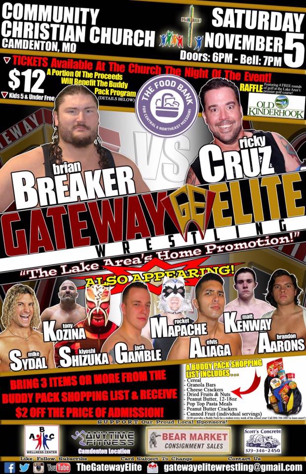 “The Lake Area’s Home Promotion” Gateway Elite Wrestling returns to the Community Christian Church (Disciples of Christ) in Camdenton, MO on Saturday November 5th! A portion of the proceeds from that night will go to The Food Bank for Central & Northeast Missouri to benefit the “Buddy Pack” program. A program “designed to get bags full of kid-friendly nutritious food to children who rely on free or reduced-price lunches during the school year.”