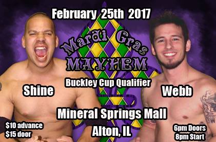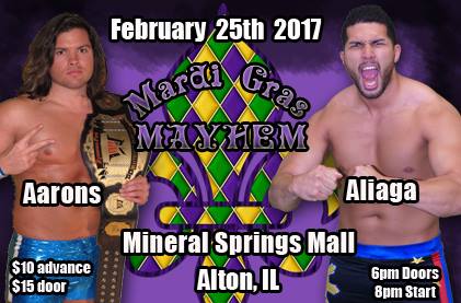 Posted in Uncategorized | Tagged: Alton Illinois, Brandon Aarons, Dynamo Pro Wrestling, Elvis Aliaga, MARDI GRAS, Michael Elgin, Mineral Springs Mall, Missouri Wrestling Revival, MWR, OuTtKaSt | Leave a Comment »
