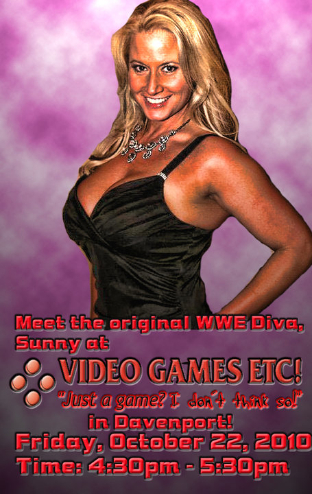 Meet the original WWE Diva, Sunny at Video Games Etc in Davenport, IA on Friday, October 22nd. Sunny will be on hand to meet with fans from 4:30-5:30pm. Come hang out with Sunny and be sure to pick up your tickets to PWN Redefined: Sterling vs. Richards taking place later that evening!