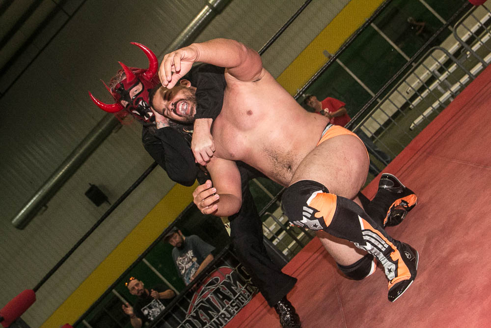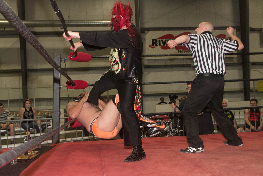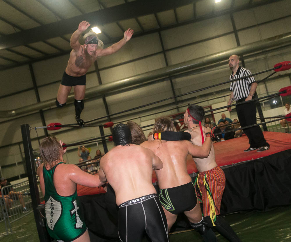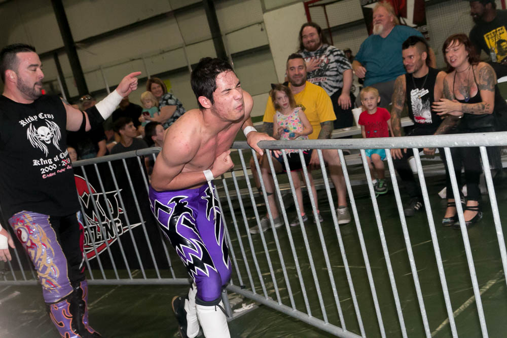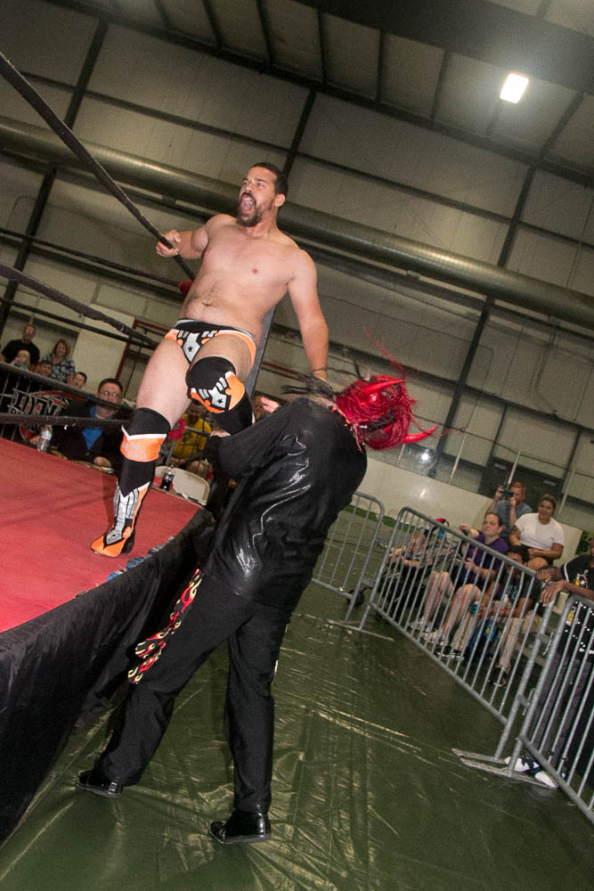 Of course, Strider had to come to the ring to “watch the match”. When Wyatt opened with several wrestling moves, Bruiser shouted “I want you to fight me, not wrestle.” No one could ever accuse Wyatt of not being accommodating. He unloaded with several shots to the head, threw Bruiser out of the ring, slammed his head onto the concession stand table and threw him into Todd’s cart of goodies. Then threw him back into the ring and asked if he had enough fighting. The match was filled with punches, chops and all out brawling. Another tussle sent them outside the ropes, which found Bruiser on the short end of the stick. While he was collecting his wits, Wyatt jerked him off the floor, pulled him to the bleachers and slammed his head onto the railing, raked his face across a zipper from the jacket of a fan and threw him back into the ring.