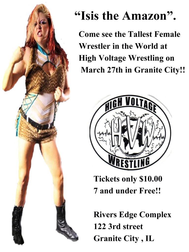 In less than 2 weeks the world’s tallest female wrestler will make her debut in St Louis at NWA Dynamo/ High Voltage Wrestling. I have long to see “ISIS” the Amazon for quite some time as MWR has kept a close eye with her fellow Coastal Championship Wrestling colleague the CAC and HVW Champion Kahagas.