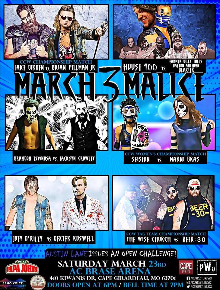 Cape Championship Wrestling and Papa John’s presents CCW March Malice 3, live at The Arena Building in Cape Girardeau, MO on 3/23/19.