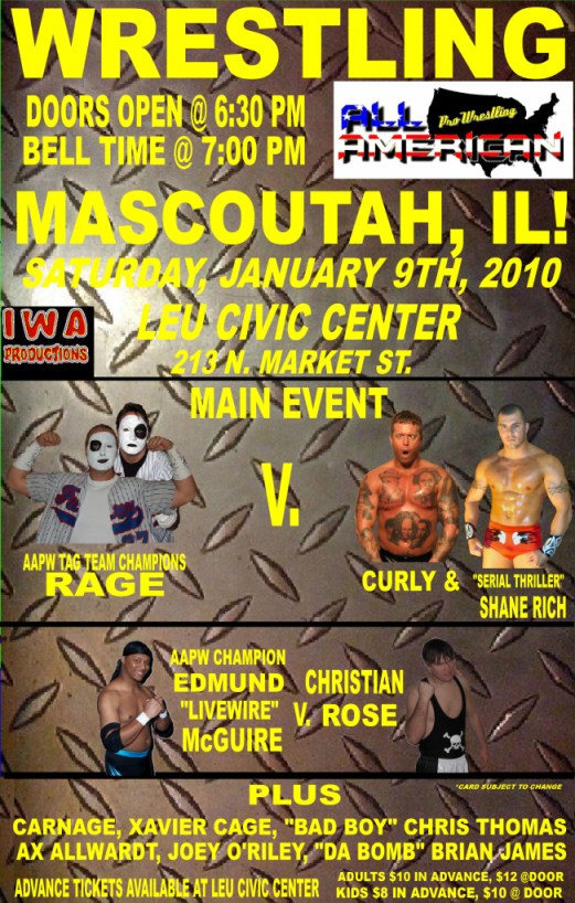 See the AAPW Champion Edmund “Livewire” McGuire in his first title defense of 2010 against the up and comer Christian Rose in a non-title bout. If Rose wins, it will earn him a future shot at the title!. McGuire is coming off the biggest victory of his career when he defeated none other than Shawn Shultz on December 5th in West Frankfort, IL for the AAPW title.