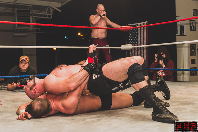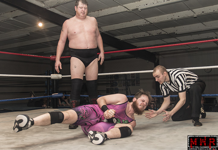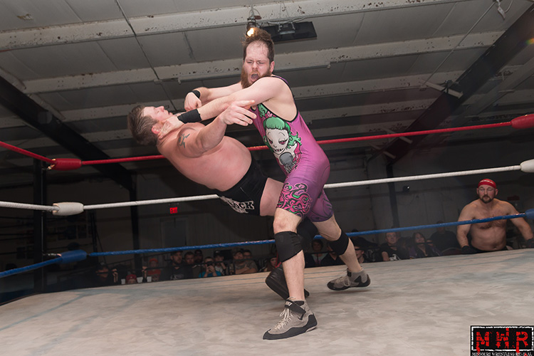Jon Webb vs. Karim Brigante (w/ Miss Monica Passeri): Good to see Brigante and Monica again…they had gone back to Italy for a little while, but recently returned to the Harley Race Dojo. Webb is an odds-on favorite in the Jr. Heavyweight Title tournament and has been expanding his arsenal in recent months; he pulled out an impressive rana counter to a vertical suplex in the match with Leland Race that just aired on their YouTube show. These guys have a really solid matchup; Monica did a fine job of jawing with the fans and interfering when the referee’s back was turned. She has wrestled in Italy (saw a few clips on YouTube) but I don’t think she’s competed in the States yet; I can only imagine the Missouri licensing headaches. Monica’s interference prevented a few chances for Webb to close things out, but it finally backfired as Webb knocked Karim into his valet, knocking her off the apron.