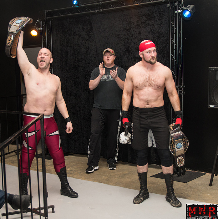 Elite Aggression (Superstar Steve Fender & “The Fittest Wrestler On Earth” Mark Sterling)(w/ Trevor Murdoch) vs. The Black Hand Warriors (Michael Magnuson & Dave DeLorean) for the Tag Team Titles: This feud stemmed from Fender and Dangerous Derek McQuinn cashing in Fender’s Harley Race Invitational Tournament opportunity after DeLorean and Jayden Fenix had won a four-team tournament for the vacant tag titles; Fender & McQuinn defeated the worn-down champions for the belts immediately after the tourney final. McQuinn suffered a recent injury and Sterling was allowed to substitute as Fender’s tag partner; I had honestly forgotten that Fender & Sterling had been Tag Champs in their own right in the past. Magnuson only recently returned to action, reuniting the original Black Hand Warriors tandem for this grudge match.