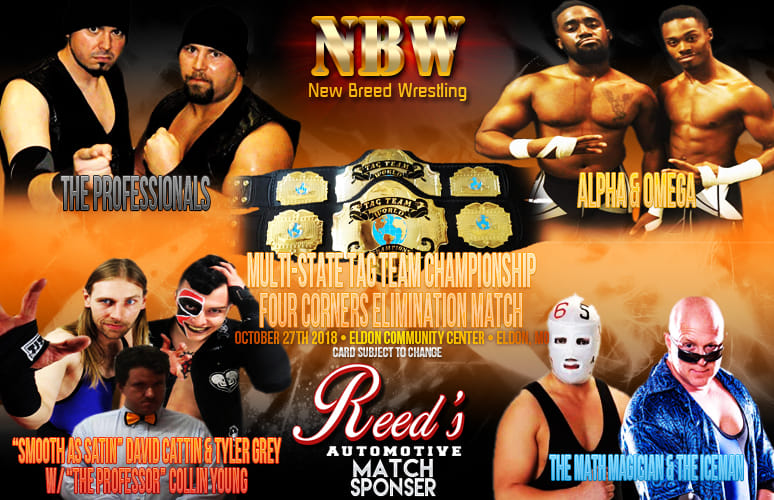 The very first Multi-State Tag Team Champions will be crowned in Eldon, MO on October 27th! In a Four Corners Elimination Match sponsored by Reed’s Automotive, we will see the teams of The Professionals, Alpha Omega, Smooth as Satin David Cattin & Tyler Grey and The Iceman & The Math Magician battle it out for the right to become champions, who will defend these belts in multiple Midwest promotions including SICW, MMWA and more!