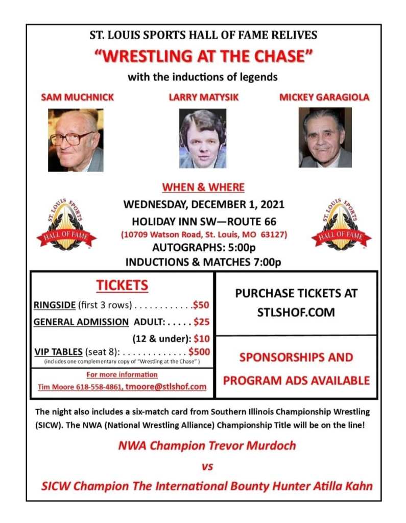On a memorable night in St. Louis, SICW teamed up with the St. Louis Sports Hall of Fame to induct Larry Matysik, Mickey Garagiola, and Sam Muchnick. SICW also teamed up with the NWA to present a NWA World title match in the main event.