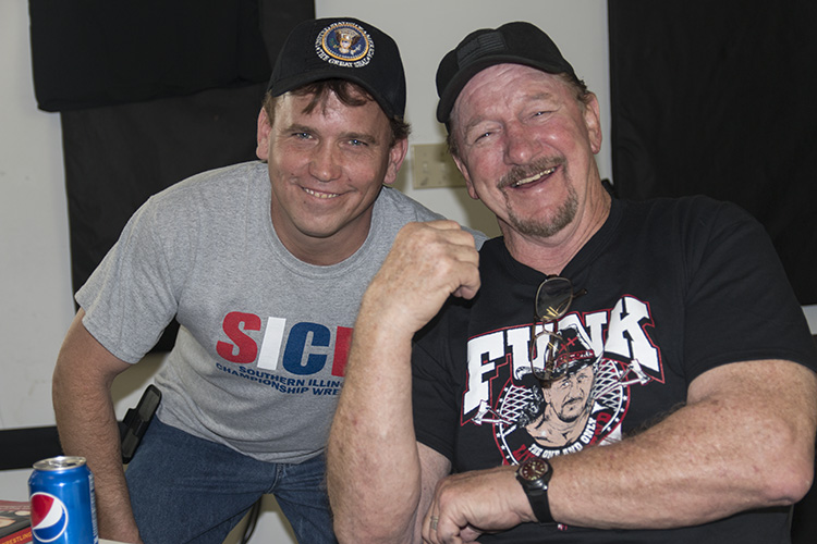 I wanted to make sure this year that I met up with Terry because the following weekend he was coming to SICW All-Star WRESTLING in East Carondelet to make an appearance. The main attraction that weekend was the “Terry Funk Title Tournament”. It was to be several matches to see who became the number one contender for the SICW Classic Championship that was currently held by Flash Flanagan. I wanted to make sure Terry remembered he was going to be a big part of the double weekend shot, you see not only was he and another Legend, Cowboy Bob Orton appearing in East Carondelet Illinois, the next day they were traveling for SICW to Cape Girardeau Missouri for not only a WRESTLING show, but during the day a Comic Con.