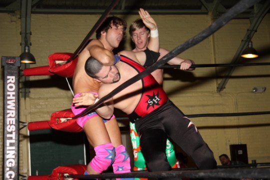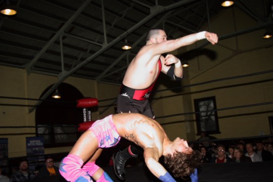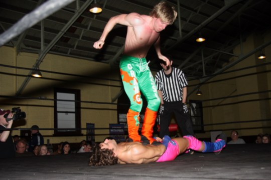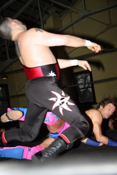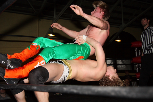 Alex Payne flies out of the ring onto Shane Hagadorn. (Photo Credit Scott Finkelstein)