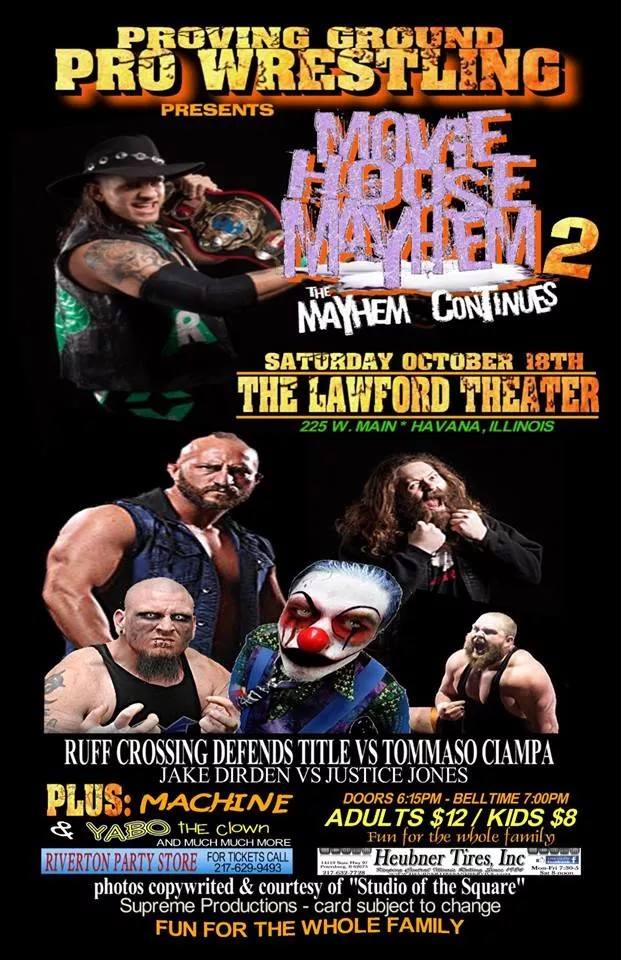 The sequel is set to eclipse the original when MOVIE HOUSE MAYHEM 2 lights up the historic Lawford Theater with Central Illinois’ favorite professional wrestling, Proving Ground Pro!!!